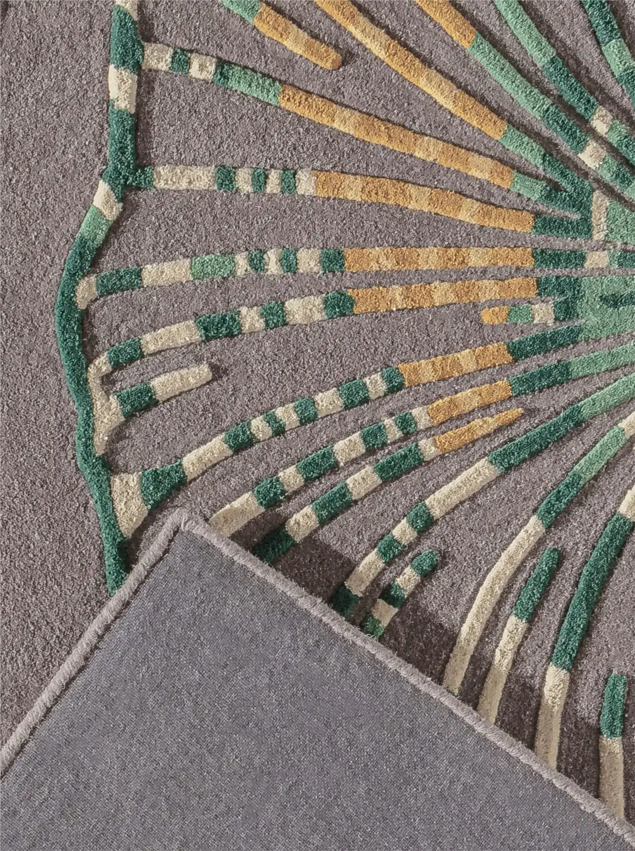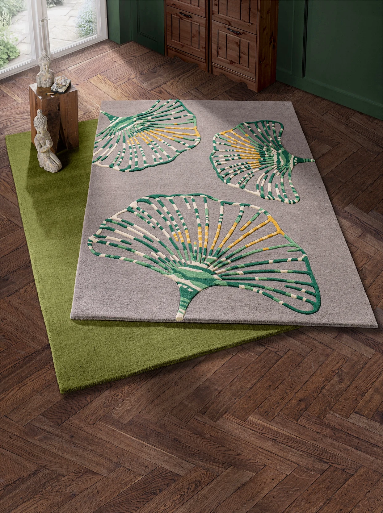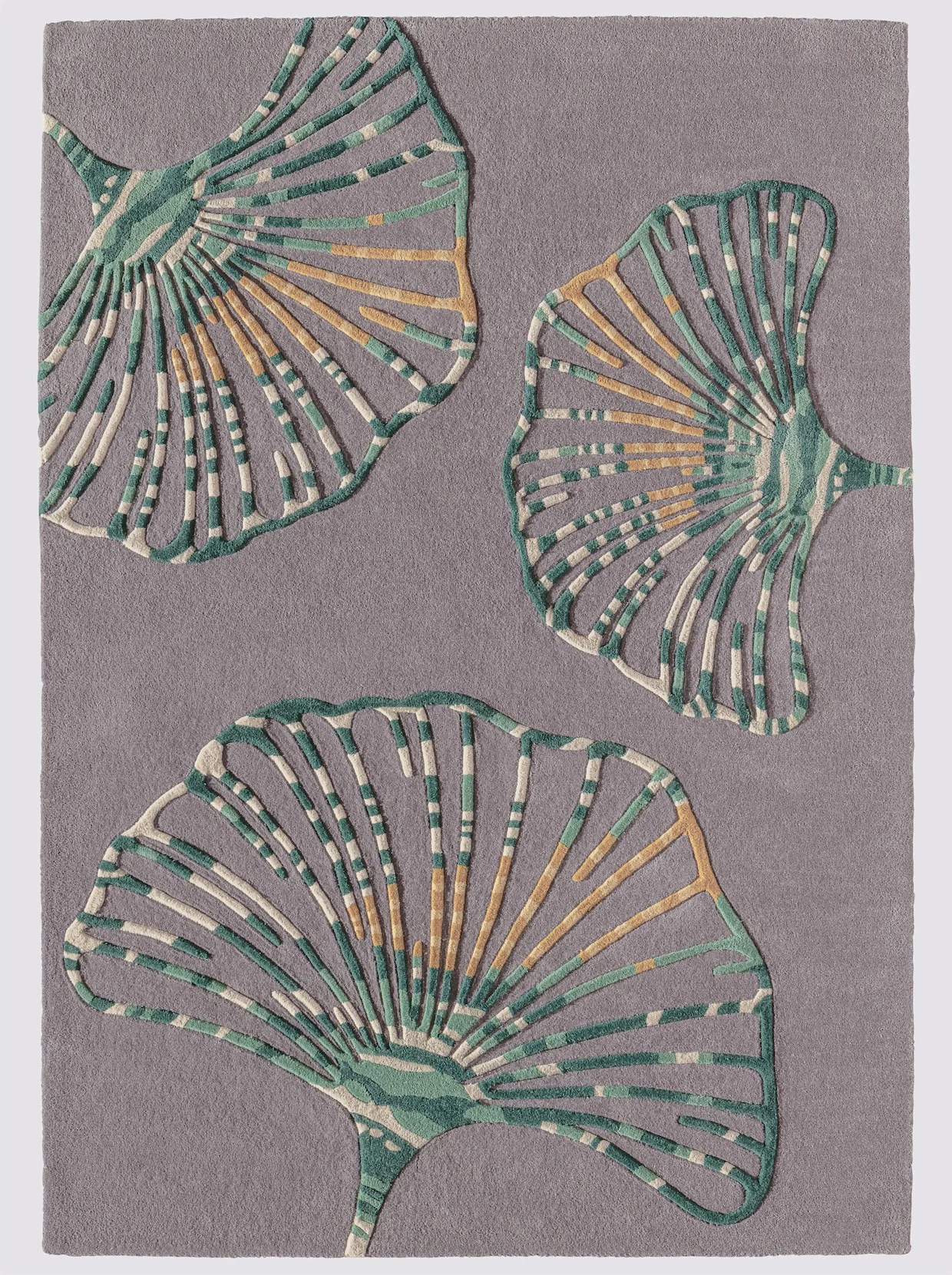 Teppich Handgewebt. Mit eingearbeitetem Ginkgomotiv in Hoch-/Tiefstruktur. Höhe ca. 20 mm.