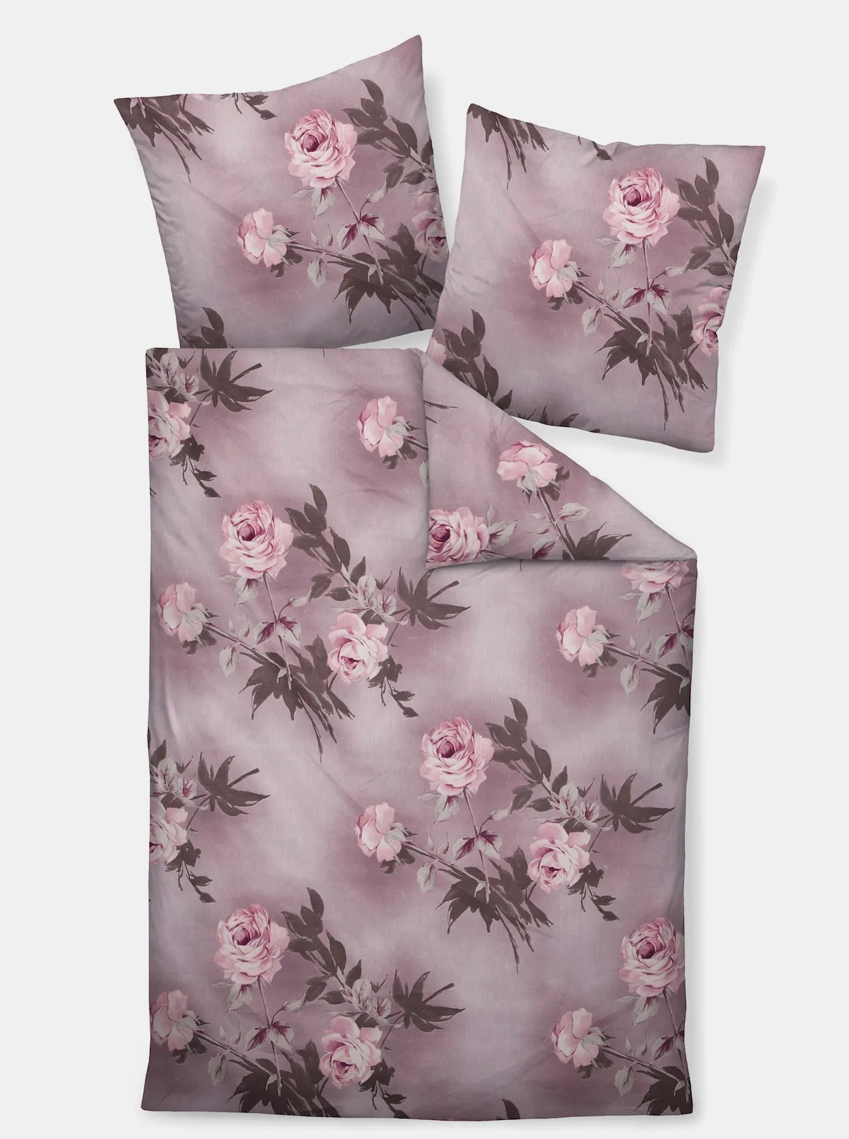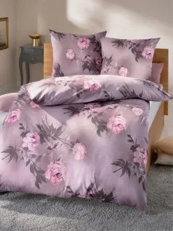 Bettwäsche in Rosen-Dessin. Mit Reißverschluss. Auch Einzelkissenbezüge erhältlich.