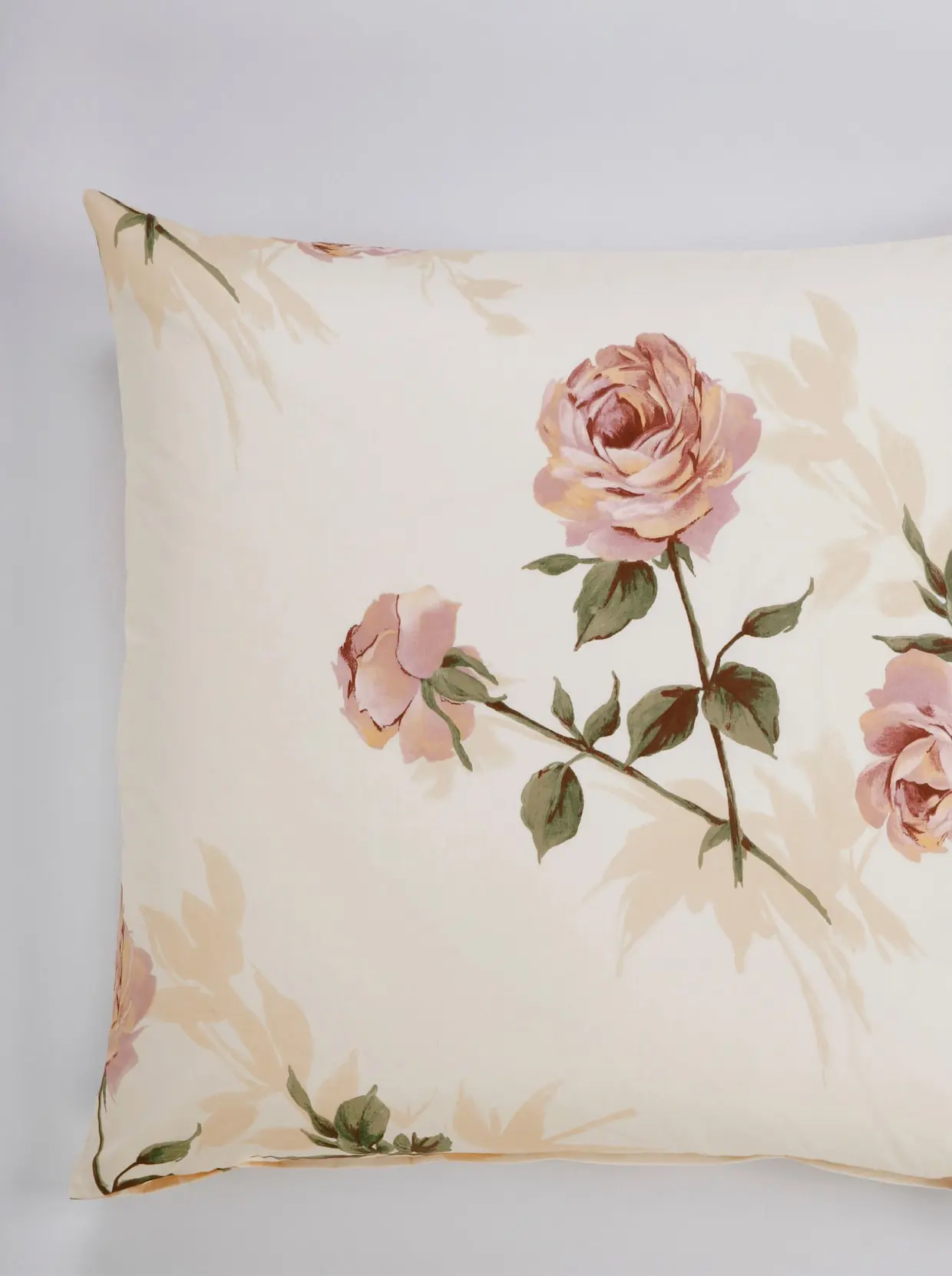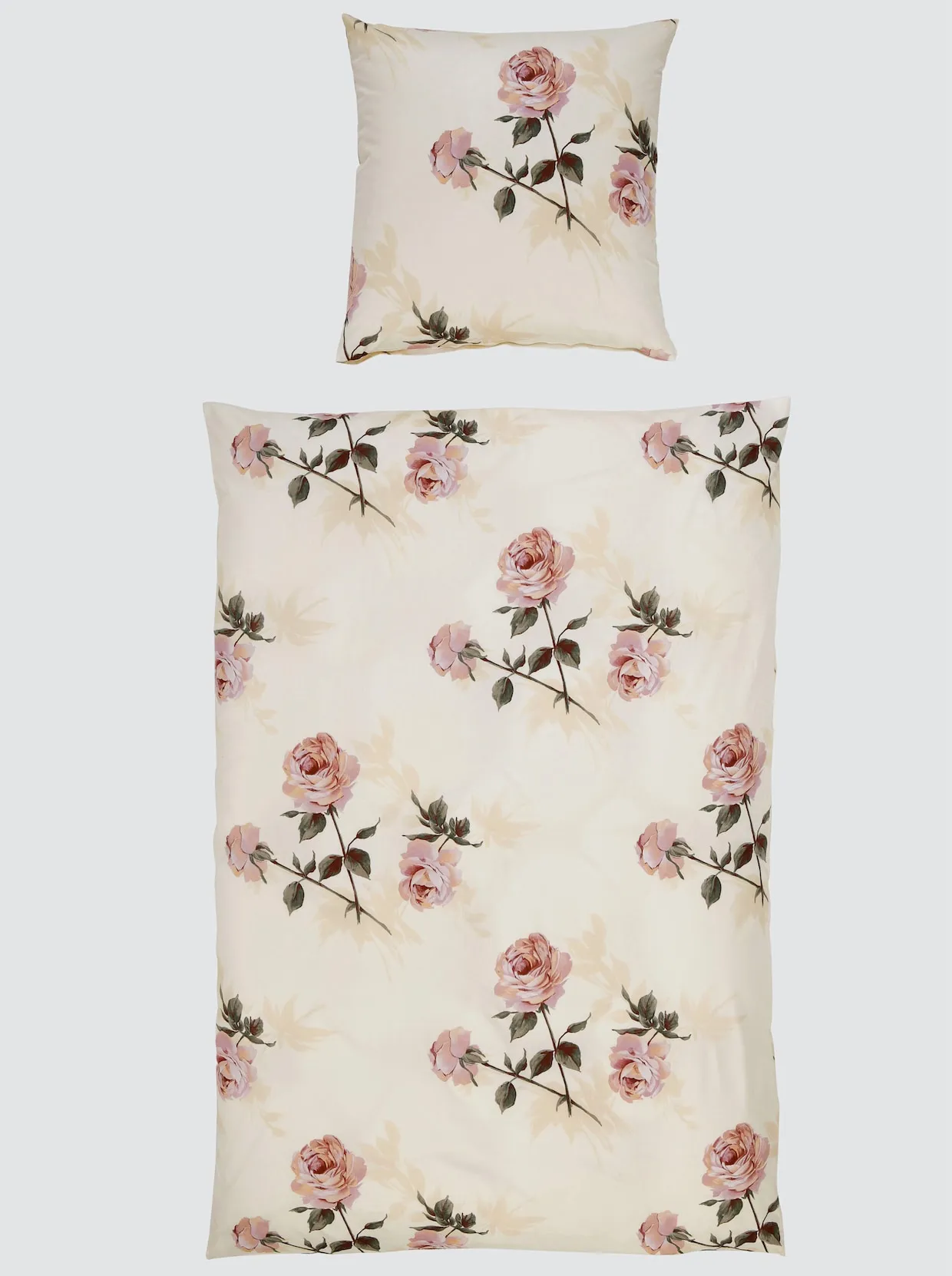 Bettwäsche in Rosen-Dessin. Mit Reißverschluss. Auch Einzelkissenbezüge erhältlich.