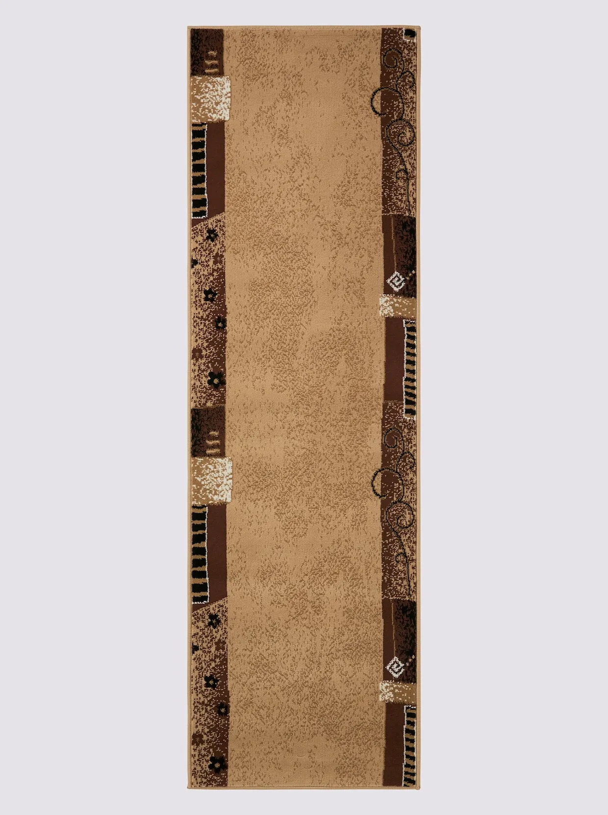 Kurzflor-Läufer-Programm in attraktiver Farbgebung. Hübsche Bordüre im Mix aus Kringeln, Tupfen und Streifen. In besonders strapazierfähiger, unempfindlicher Qualität. In vielen Größen erhältlich. Maschinell gefertigt, Abschlüsse ringsum gekettelt. Höhe ca. 8 mm.
