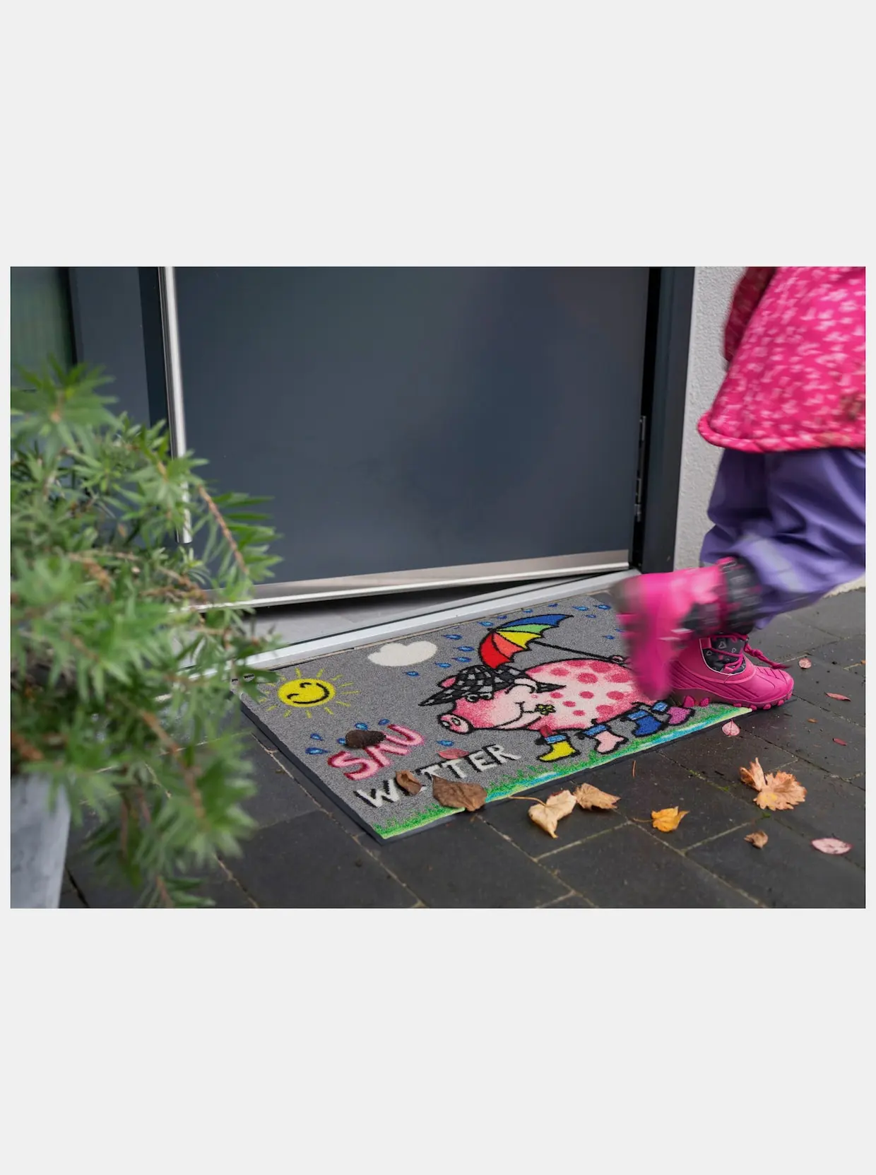 Fußmatte Mit originellem Schweine-Motiv und SAUWETTER-Schriftzug. Made in Germany. Äußerst strapazierfähig und pflegeleicht. Für den Innen- und überdachten Außenbereich geeignet. Rückseite rutschhemmend beschichtet. Für Fußbodenheizung geeignet. PVC-frei. 5 Jahre Qualitätsgarantie.