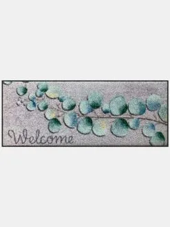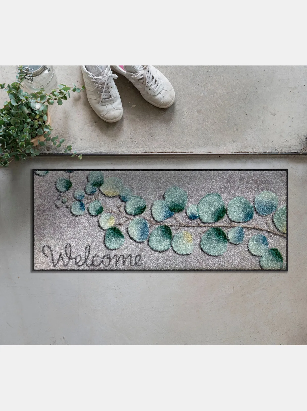 Fußmatte Mit stilvollem Eukalyptus-Motiv und WELCOME-Schriftzug. Made in Germany. Äußerst strapazierfähig und pflegeleicht. Für den Innen- und überdachten Außenbereich geeignet. Rückseite rutschhemmend beschichtet. Für Fußbodenheizung geeignet. PVC-frei. 5 Jahre Qualitätsgarantie.