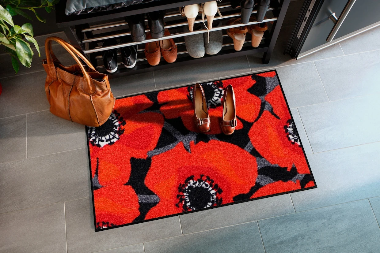 Fußmatte Sehr dekorativ mit leuchtenden Mohnblüten. Äußerst strapazierfähig und pflegeleicht. Für den Innen- und überdachten Außenbereich geeignet. Rückseite rutschhemmend beschichtet. Für Fußbodenheizung geeignet. PVC-frei. 5 Jahre Qualitätsgarantie.
