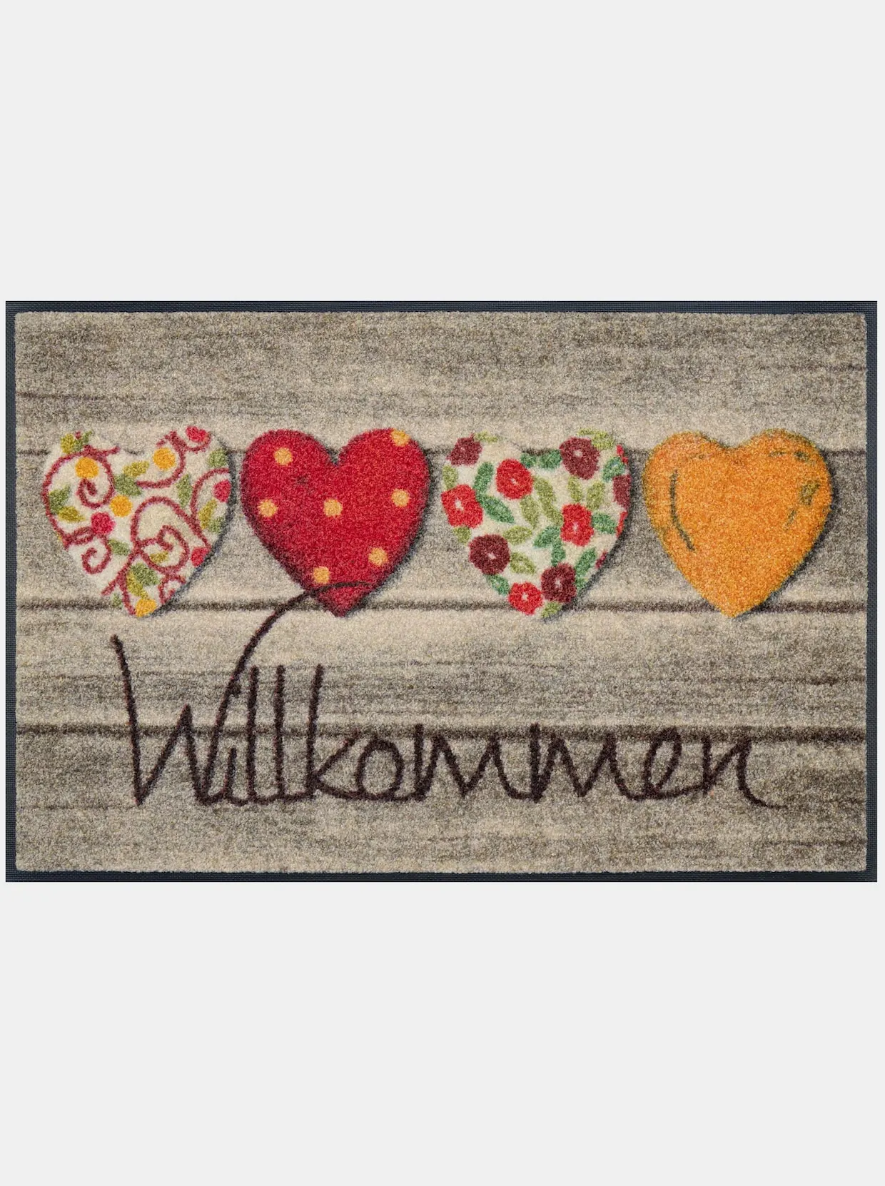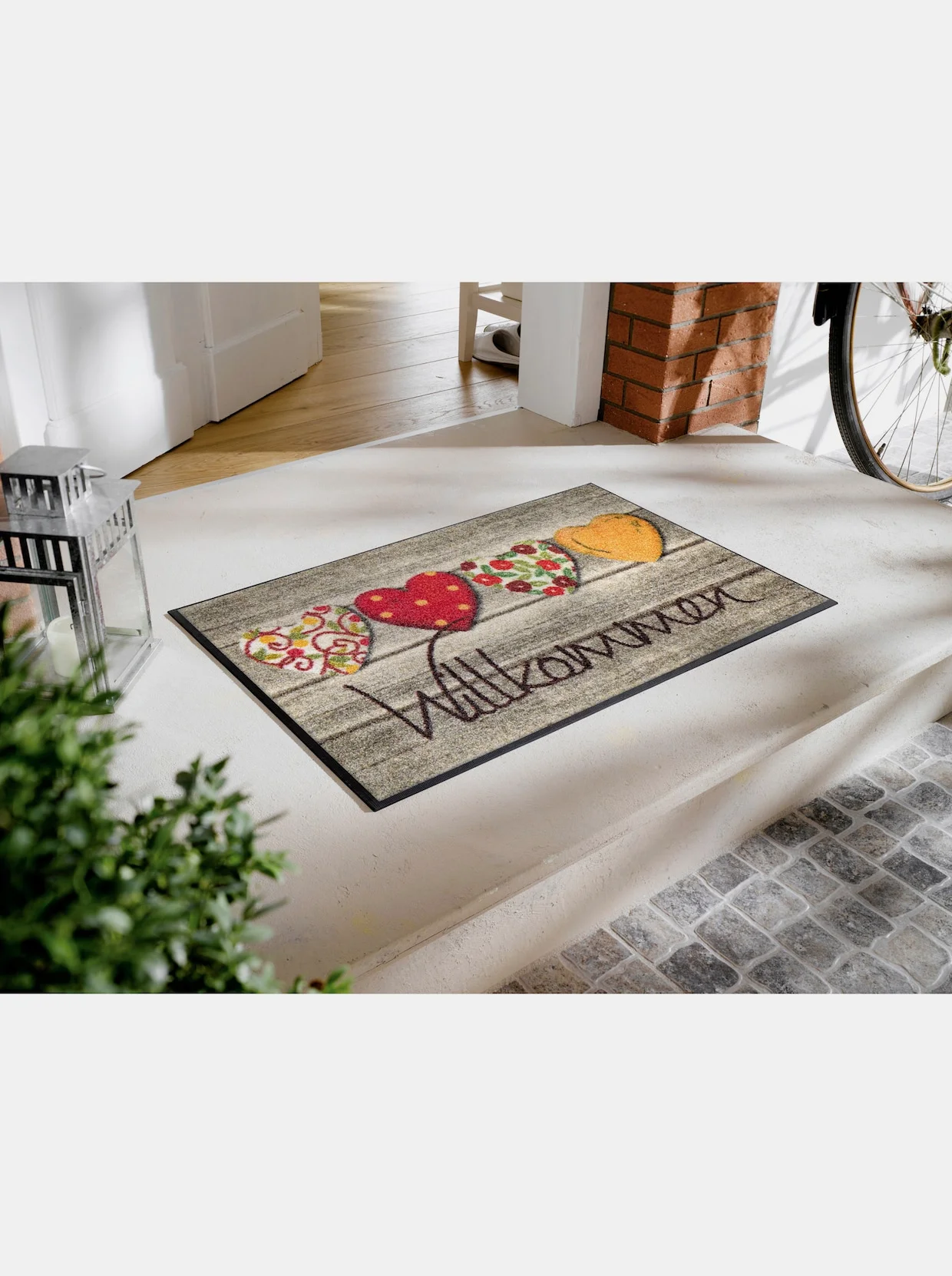 Fußmatte Mit WILLKOMMEN-Schriftzug und Herz-Motiv. Äußerst strapazierfähig und pflegeleicht. Für den Innen- und überdachten Außenbereich. Rückseite rutschhemmend gummiert. PVC-frei. Für Fußbodenheizung geeignet, 5 Jahre Qualitätsgarantie.