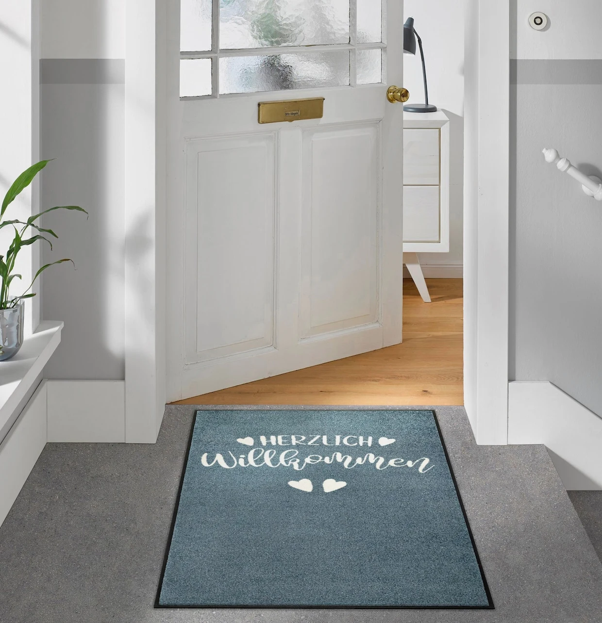 Fußmatte Mit „Herzlich Willkommen“-Schriftzug. Äußerst strapazierfähig und pflegeleicht. Für den Innen- und überdachten Außenbereich geeignet. Rückseite rutschhemmend beschichtet. Für Fußbodenheizung geeignet. PVC-frei. 5 Jahre Qualitätsgarantie.