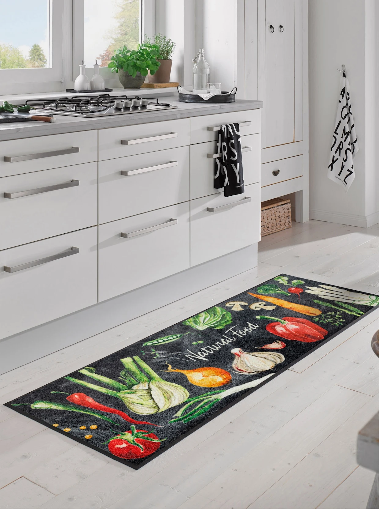 Fußmatte Mit NATURAL FOOD-Schriftzug und Gemüse-Motiv. Äußerst strapazierfähig und pflegeleicht. Für den Innen- und überdachten Außenbereich. Rückseite rutschhemmend gummiert. PVC-frei. Für Fußbodenheizung geeignet, 5 Jahre Qualitätsgarantie.