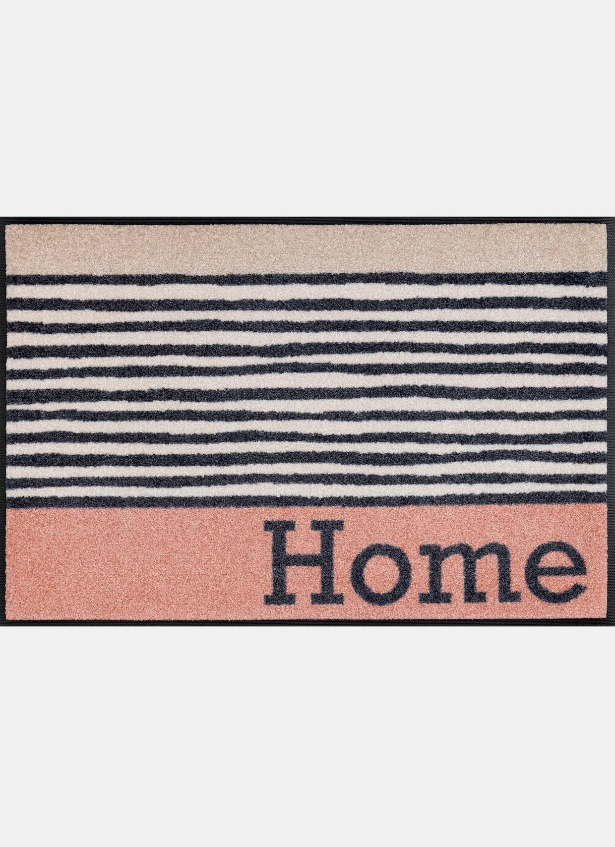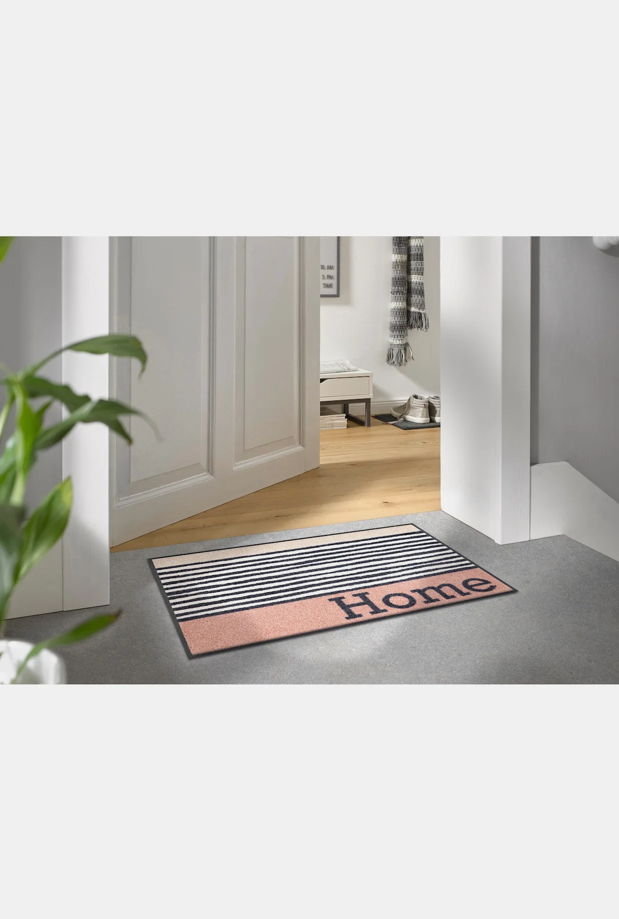 Fußmatte Mit HOME-Schriftzug und Streifen. Äußerst strapazierfähig und pflegeleicht. Für den Innen- und überdachten Außenbereich. Rückseite rutschhemmend gummiert. PVC-frei. Für Fußbodenheizung geeignet, 5 Jahre Qualitätsgarantie.
