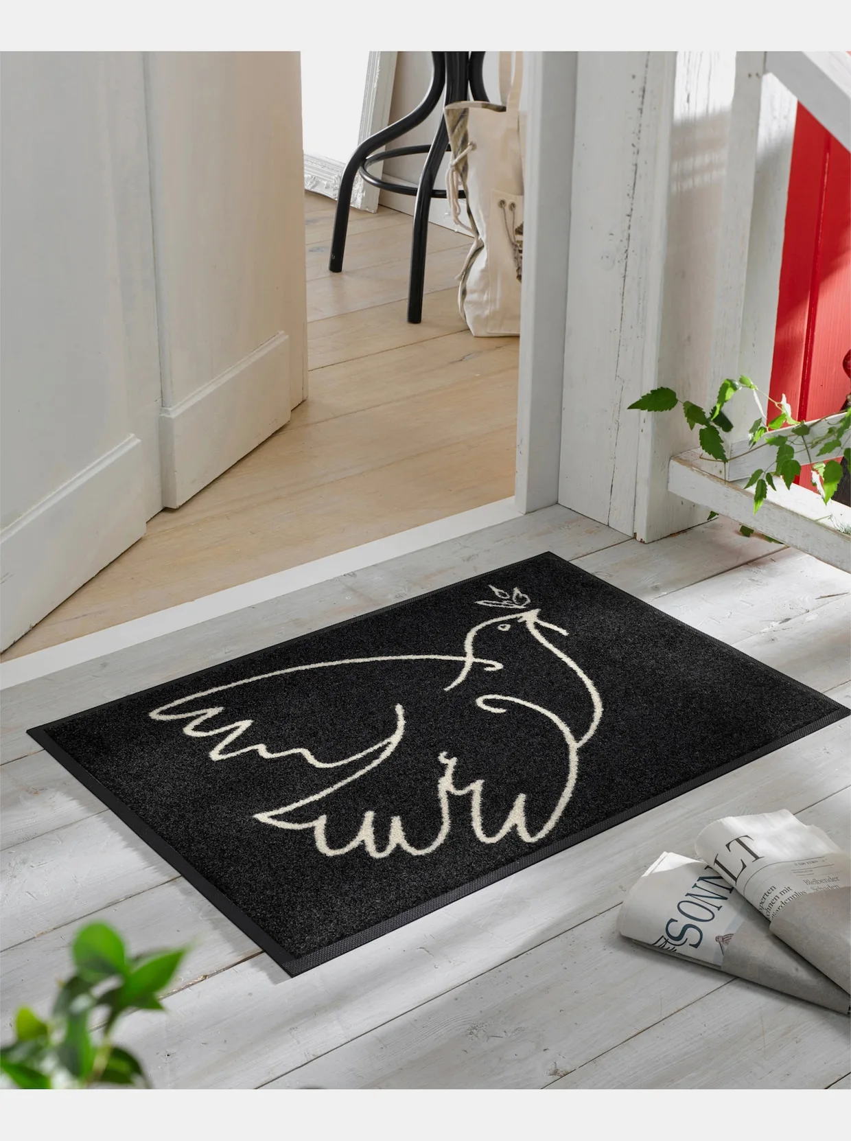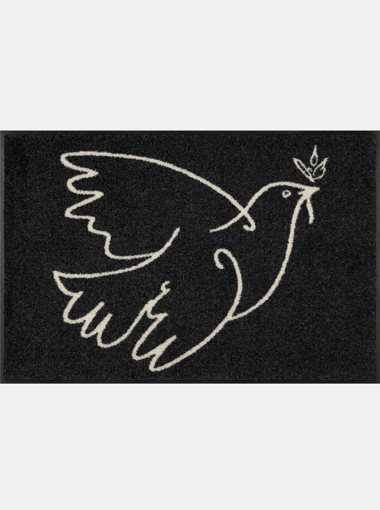 Fußmatte Mit Friedenstaube-Motiv. Äußerst strapazierfähig und pflegeleicht. Für den Innen- und überdachten Außenbereich. Rückseite rutschhemmend gummiert. PVC-frei. Für Fußbodenheizung geeignet, 5 Jahre Qualitätsgarantie.