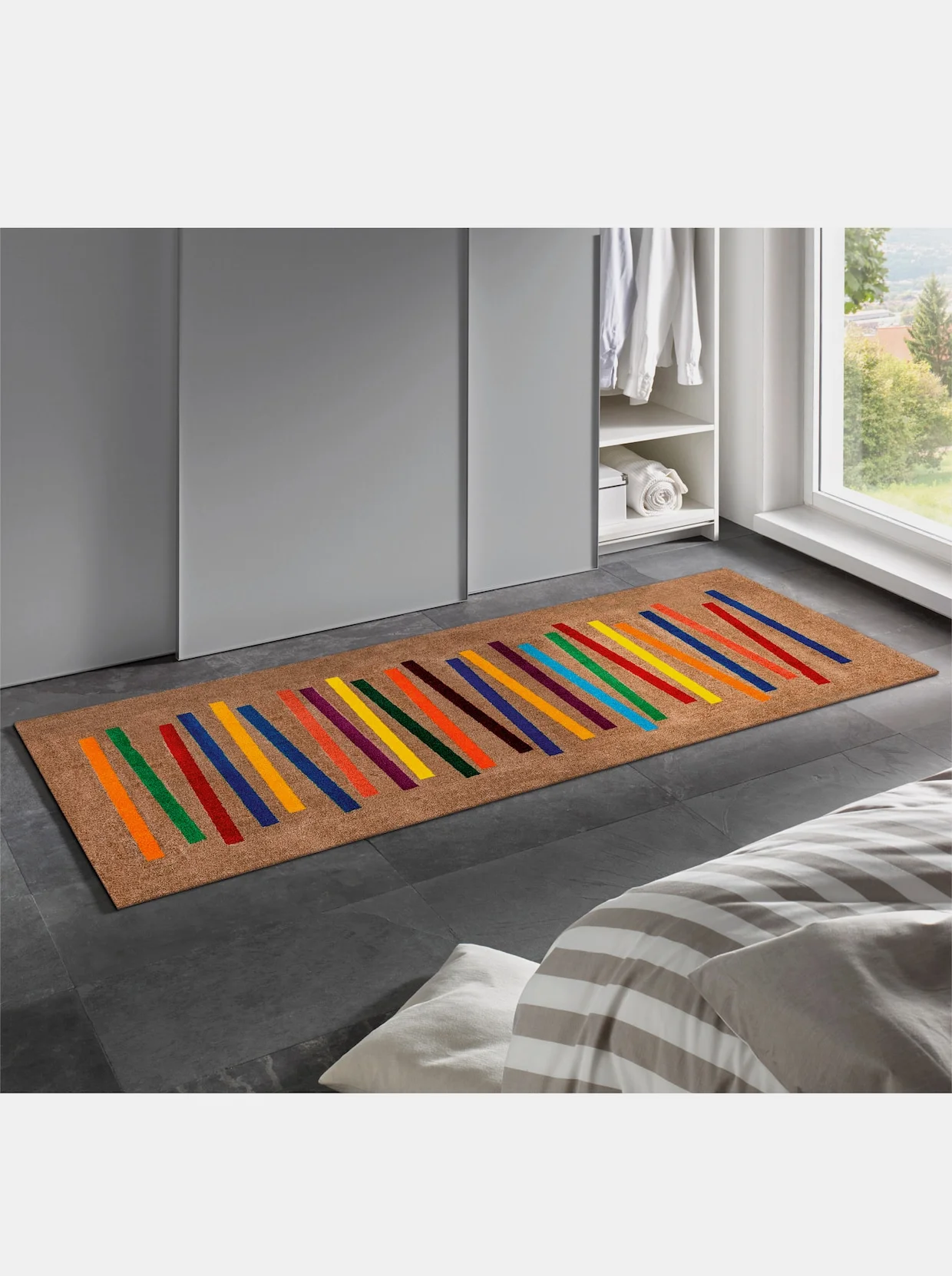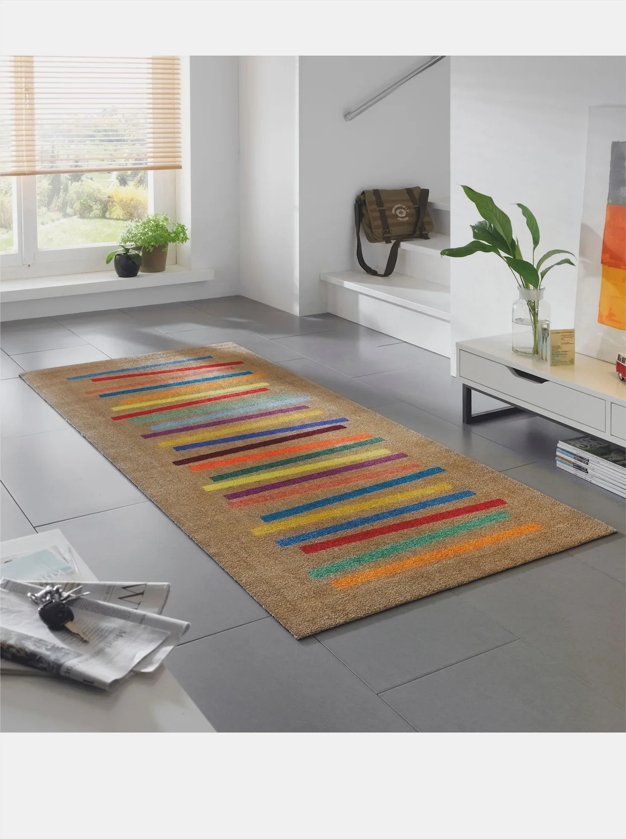 Fußmatte Sehr dekorativ mit farbenfrohem Streifen-Dessin. Äußerst strapazierfähig, für den Innen- und überdachten Außenbereich. Rückseite rutschhemmend gummiert. Ohne Gummirand. PVC-frei. Für Fußbodenheizung geeignet. 5 Jahre Qualitätsgarantie.